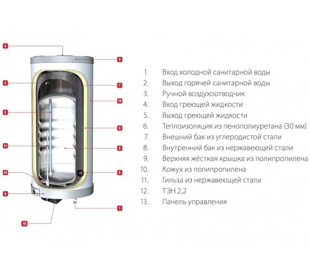 1 - ручной воздухоотводчик 2 - забор горячей санитарной воды в систему ГВС 3 - подача холодной санитарной воды в бойлер 4 - подача теплоносителя в греющий контур бойлера 5 - отвод теплоносителя к котлу 6 - теплоизоляция из пенополиуретана 7 - бак из углеродистой стали 8 - бак из нержавеющей стали 9 - кожух из эластичного полипропилена |