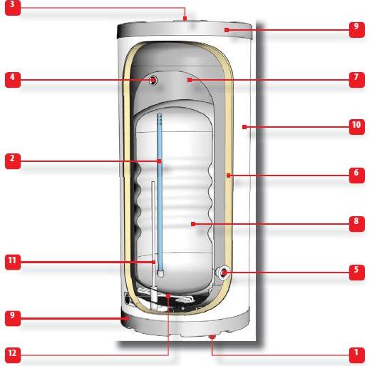1 - вход холодной санитарной воды 2 - выход горячей санитарной воды 3 - ручной воздухоотводчик 4 - вход греющей жидкости 5 - выход греющей жидкости 6 - теплоизоляция из пенополиуретана (30 мм) 7 - внешний бак из углеродистой стали 8 - внутренний бак из нержавеющей стали 9 - верхняя жесткая крышка из полипропилена 10 - кожух из полипропилена 11 - гильза из нержавеющей стали 12 - ТЭН |