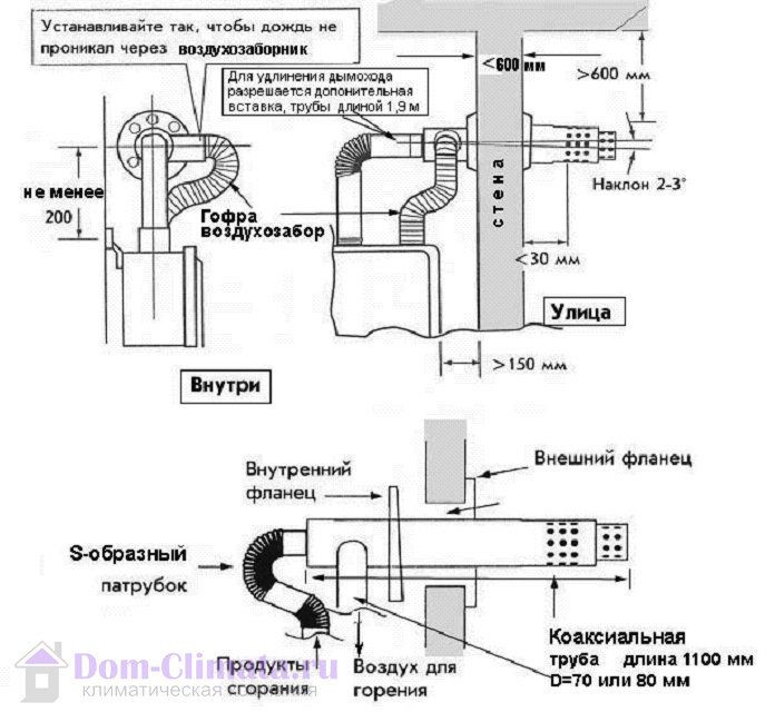 Монтаж коаксиального дымохода производить согласно рис. (см.ниже):
