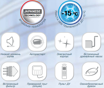 Особый комфорт дает возможность организации притока свежего воздуха через внутренний блок и отвода части обработанного воздуха в сторону. Благодаря этой технологии создается дополнительная подача воздушного потока, например, в удаленное место. Это делает применение сплит-системы Royal Clima CO-4C 12HN максимально универсальным и удобным. Встроенный дренажный насос позволяет легко организовать отвод конденсата из внутреннего блока. Установленный во внешнем блоке контроллер работы при низких температурах позволяет осуществлять эффективное охлаждение при температуре наружного воздуха до −15С.