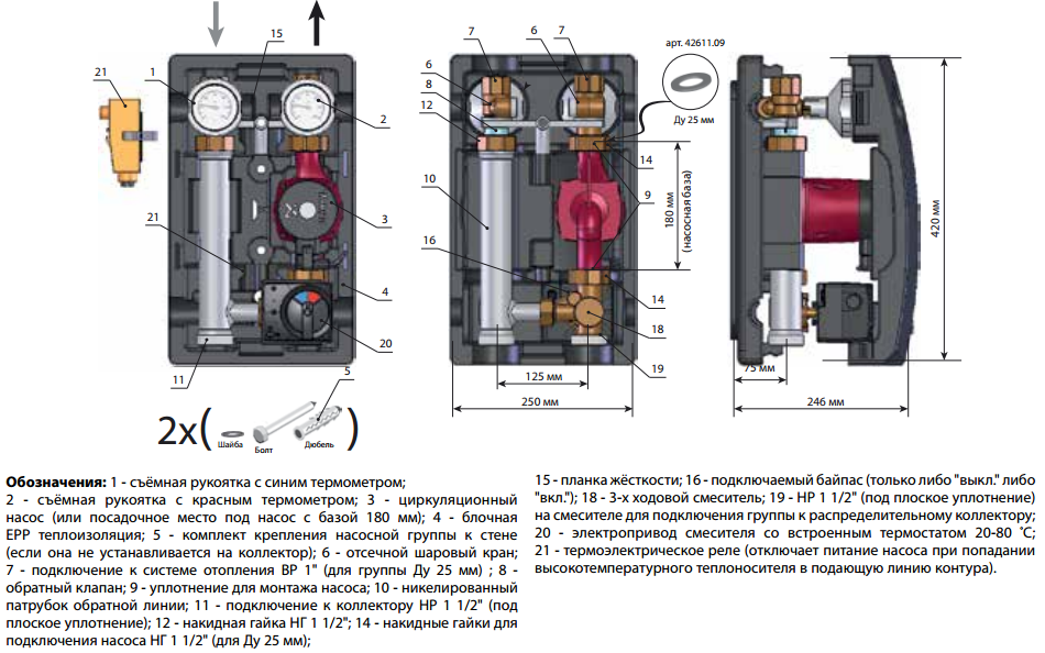 Meibes ME45890.5 EA RU — насосная группа, предназначенная для установки в качестве контура теплого пола площадью до 250 м2. Данная группа применяется в смесительном контуре, который способен по установленному электронному термостату поддерживать постоянную температуру обратной линии.