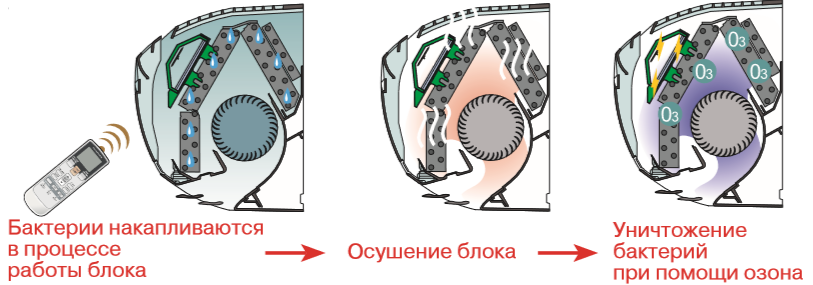 Осушение теплообменника позволяет предотвратить образование плесени и рост бактерий во внутреннем блоке. В этом режиме эксплуатация змеевика продолжается еще 30 минут после нажатия кнопки COIL DRY и останавливается автоматически. В течение примерно 15 минут происходит сушка внутреннего блока. Затем на 15 минут включается режим стерилизации озоном. При этом бактерии и споры плесени, которые накапливаются во внутреннем блоке в процессе работы кондиционера, будут полностью уничтожены.