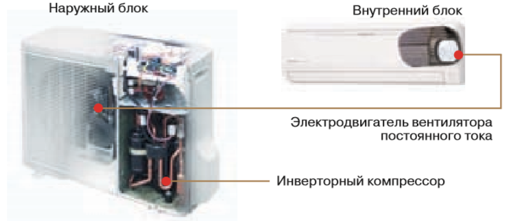 DC-инверторное управление компрессором и электродвигателями вентиляторов наружного и внутреннего блоков, что позволяет снизить потребление электроэнергии и уровень шума. |
