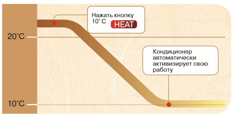 Режим поддержания +10 °С в режиме обогрева позволяет предотвратить слишком сильное снижение температуры в комнате в зимнее время.